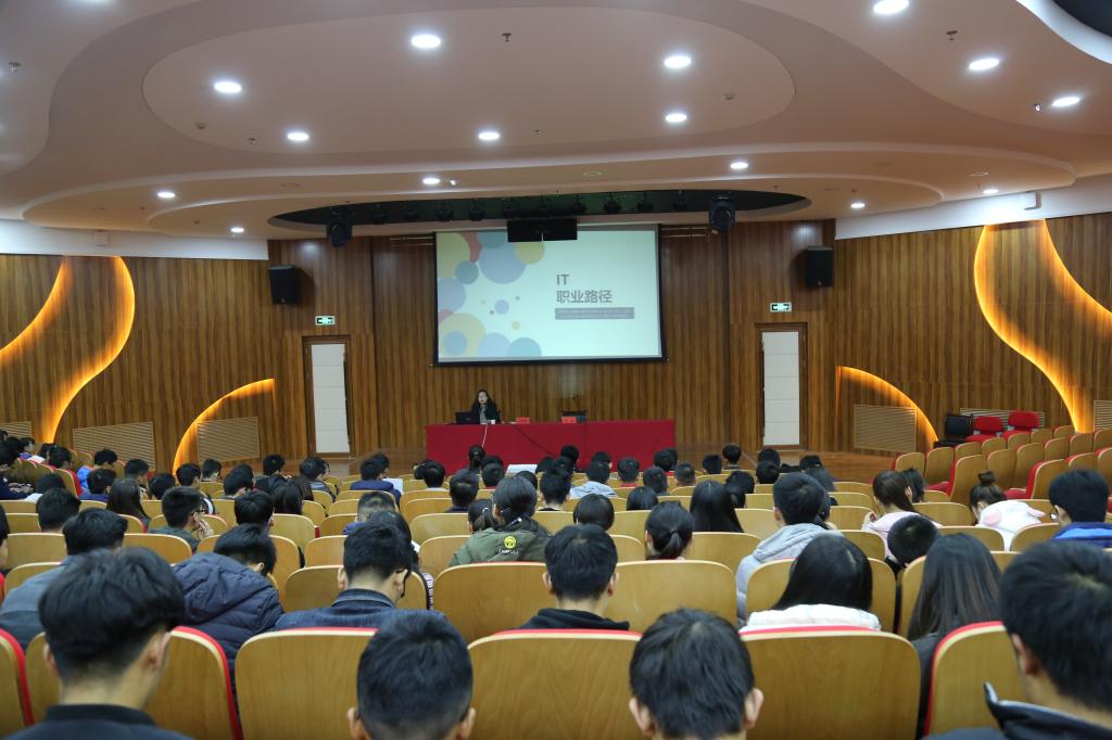 2017年11月27日晚,信息科学技术学院在综合剧场1号厅举办了题为“IT职业路径”专业学术报告。本次学术报告主讲为学院信息管理与信息系统系系主任吴丽丽老师,学院2017—2014级信息管理与信息系统专业4个行政班级共计230余人到场参加。