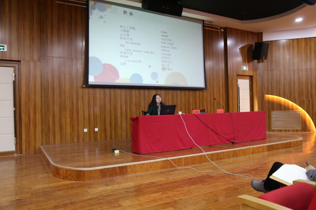 报告会上,吴丽丽老师结合自身多年的专业教学及就业指导经验,从职业要求、从业职能、薪资、规划等几个方面全面、系统、深入地进行了讲解。分析了IT行业中“UI设计”、“WEB前端”、“大数据”、“云计算”等在当下的就业前景和市场需求。尤其对“大数据时代”IT行业的本质、核心及面临的巨大发展机遇向学生们详细做了引导,她指出,IT技术是当下的朝阳产业,有广阔的市场前景,广大学生要勇于面对挑战,不断提升自身专业素养,早日为社会做出应有的贡献。